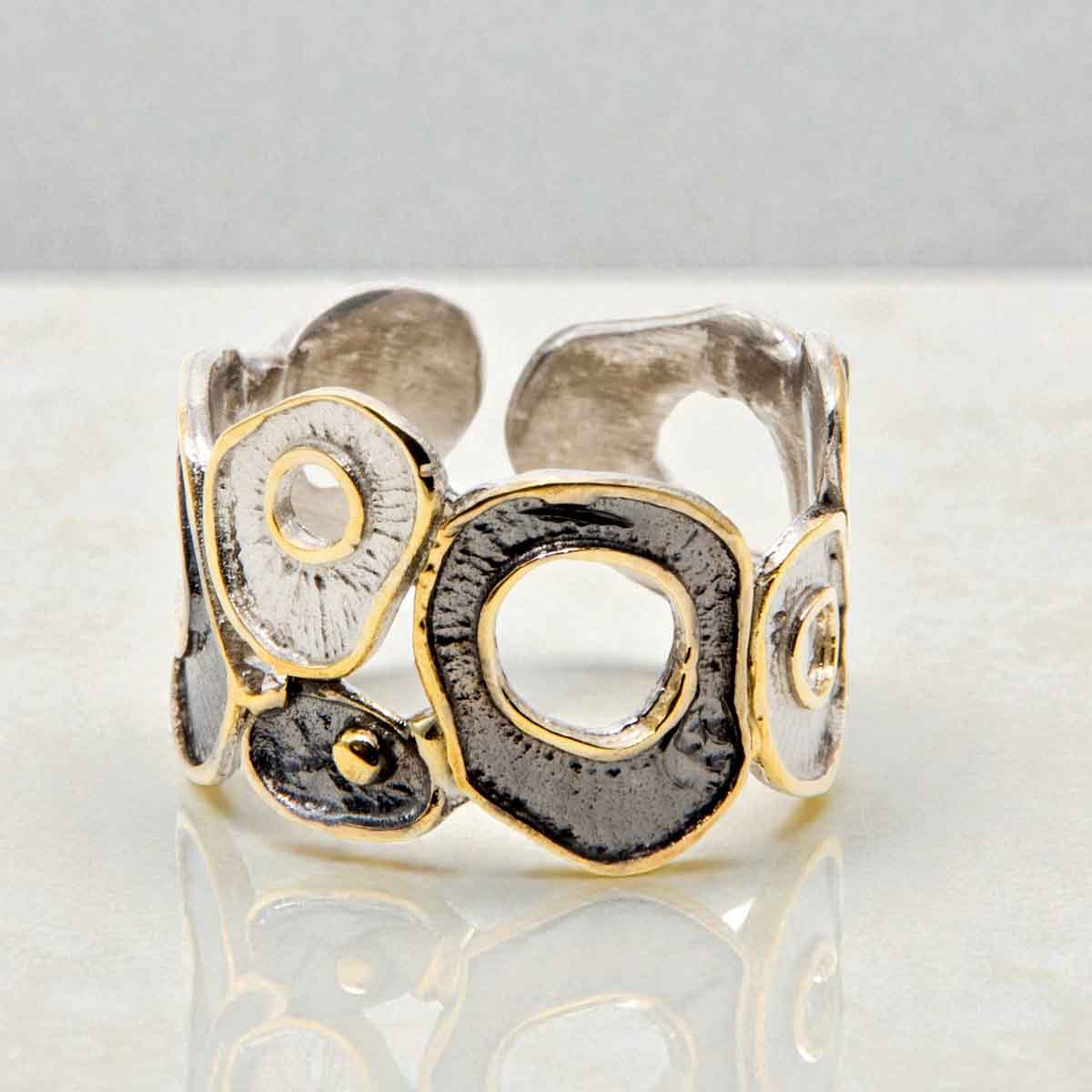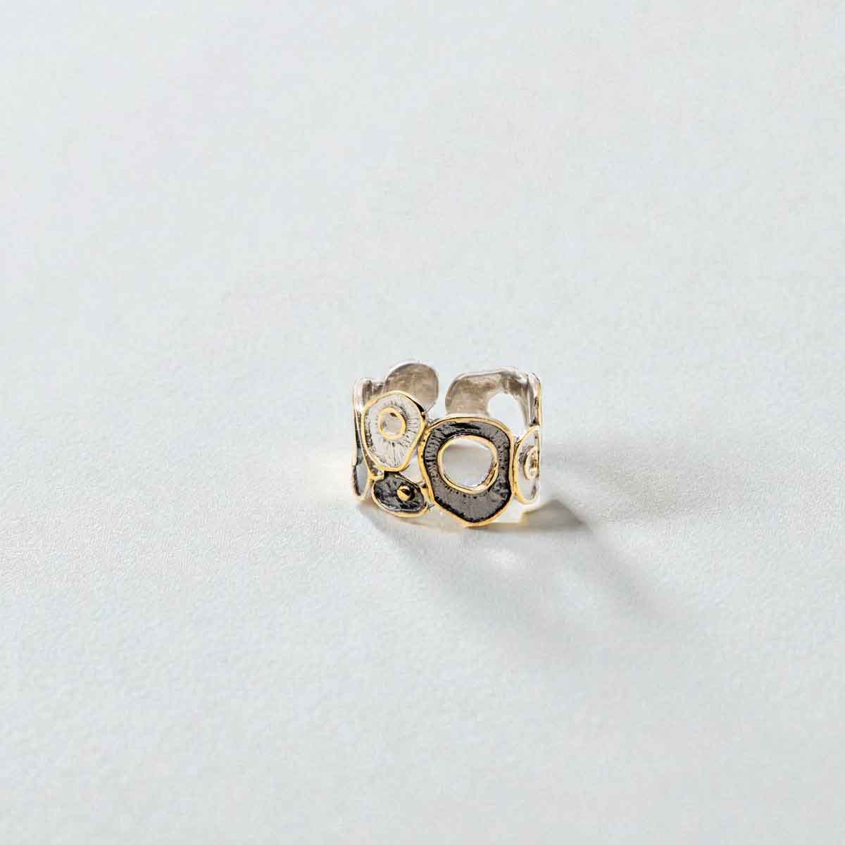 Χειροποίητο δαχτυλίδι απο ασήμι 925° με επίχρυσες λεπτομέρειες και μαύρο ρόδιο. Εντυπωσιακό κόσμημα με ασύμμετρες καμπύλες και δυναμική παρουσία, ιδανικό για σύγχρονο στυλ. Το μέγεθός του αυξομειώνεται απο Νο 48 εώς και Νο 58