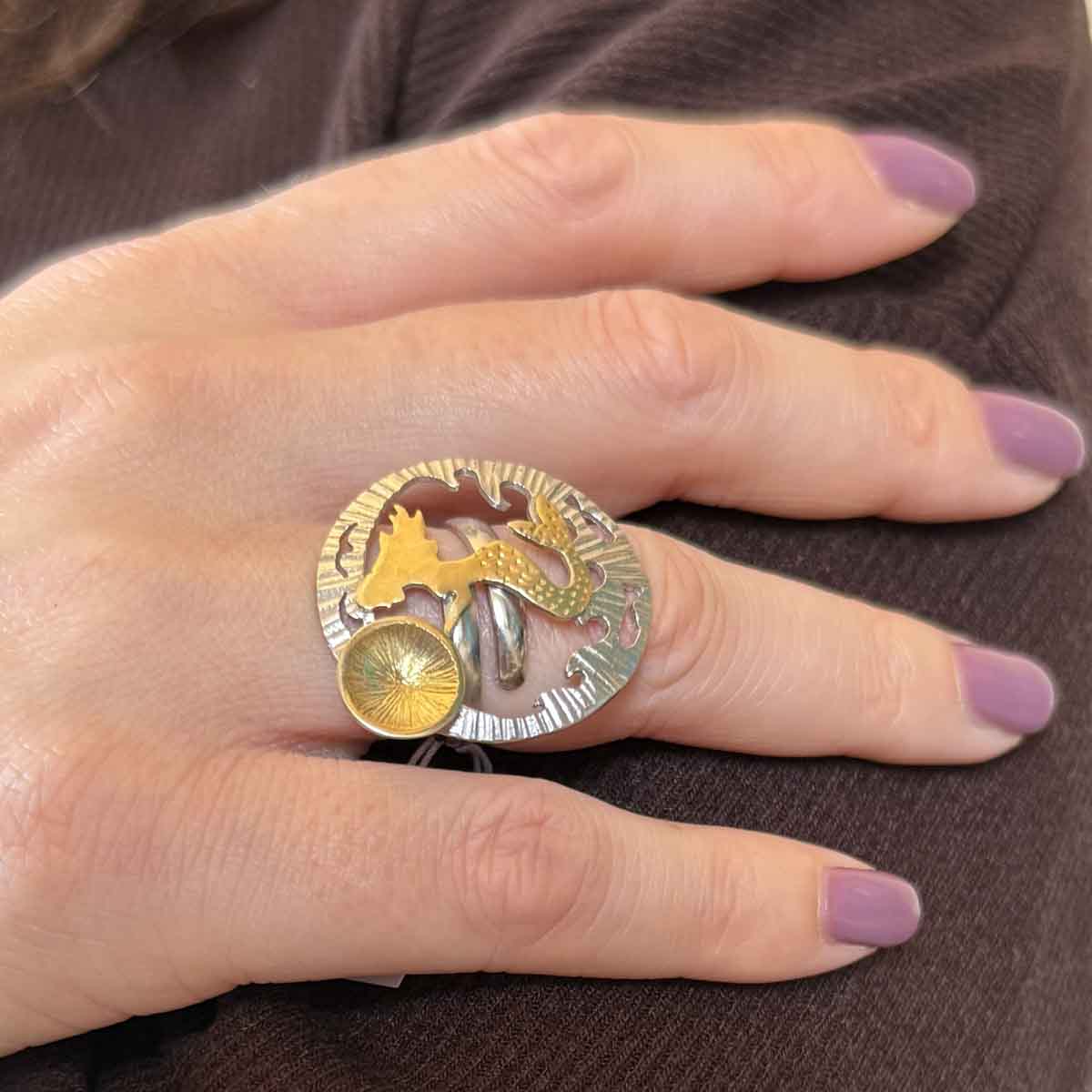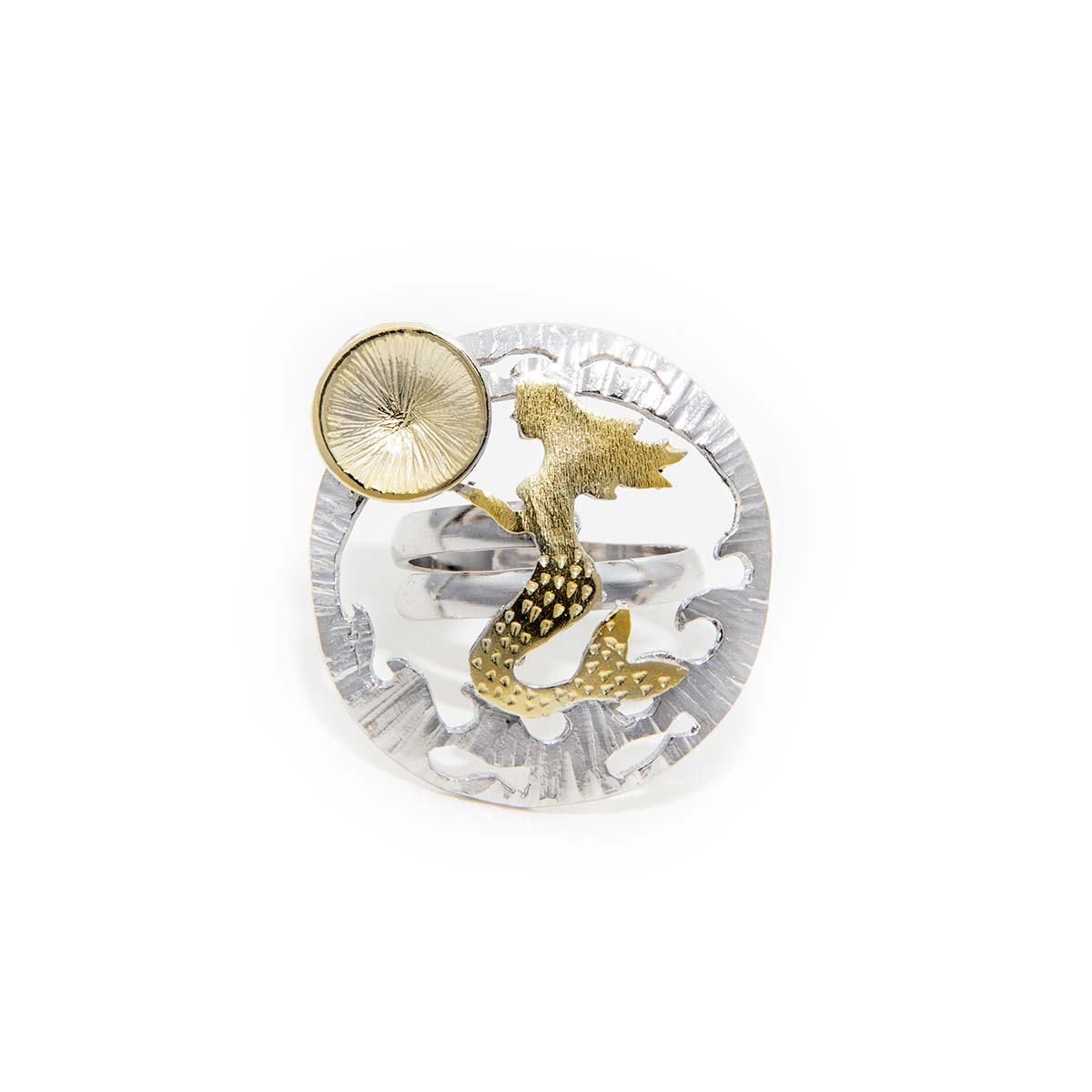 Χειροποίητο δαχτυλίδι απο ασήμι 925° με επίχρυσες λεπτομέρειες. Αφέσου στη μαγεία της θάλασσας με αυτό το υπέροχο, χειροποίητο δαχτυλίδι γοργόνας. Δημιουργημένο με αγάπη και προσοχή στη λεπτομέρεια, αποπνέει θηλυκότητα και φαντασία. Το μέγεθός του αυξομειώνεται και ταιριάζει σε όλα τα δάχτυλα