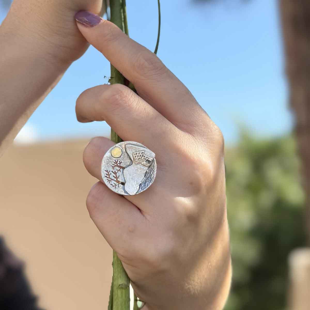 Χειροποίητο δαχτυλίδι απο ασήμι 925° με επίχρυσες λεπτομέρειες. Το καταφύγιο που όλοι έχουμε ανάγκη στη ζωή μας. Το μέγεθός του αυξομειώνεται και ταιριάζει σε όλα τα δάχτυλα