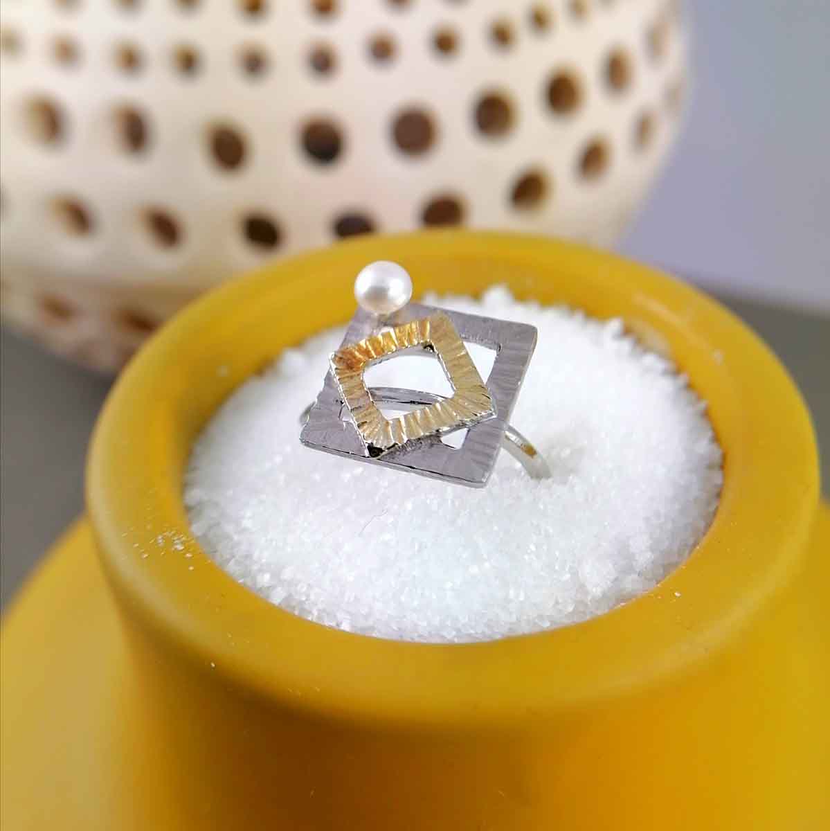 Χειροποίητο δαχτυλίδι απο ασήμι 925° με επίχρυσες λεπτομέρειες και πέρλα.Απλότητα,φώς,ισορροπία και διαχρονικότητα.Το μέγεθός του αυξομειώνεται και ταιριάζει σε όλα τα δάχτυλα