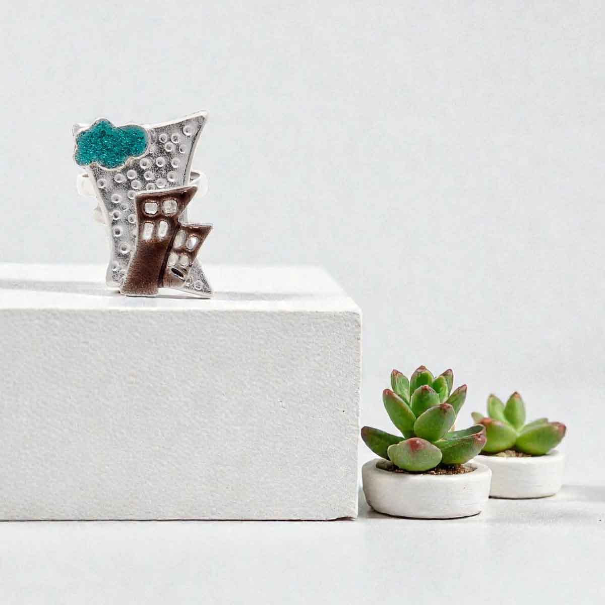 Χειροποίητο δαχτυλίδι απο ασήμι 925° με χρώμα. Χειροποίητο κόσμημα που ενώνει το παλιό και το νέο — φόρμες που θυμίζουν τη δομή και την ψυχή μιας πόλης. Το μέγεθός του αυξομειώνεται και ταιριάζει σε όλα τα δάχτυλα