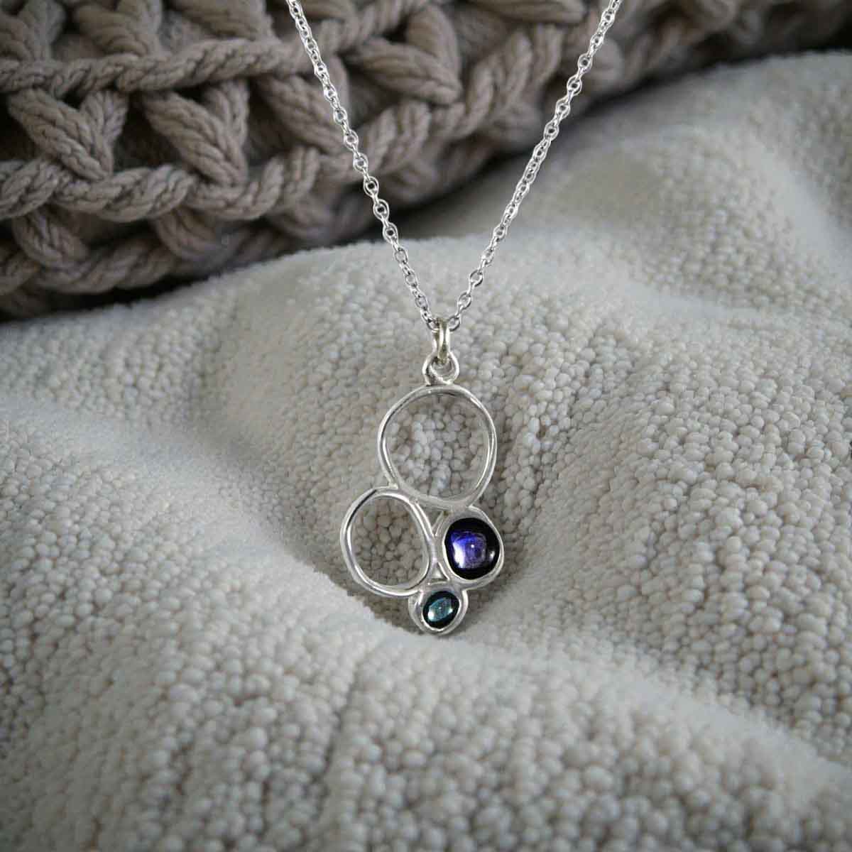 Χειροποίητο μενταγιόν απο ασήμι 925° με μπλε και τιρκουάζ χρώματα σμάλτου σε αλυσίδα 925° μήκους 40 εκ. με 5 εκ. προέκταση. Ασημένιοι ασύμμετροι κύκλοι με μπλε και τιρκουάζ αύρα