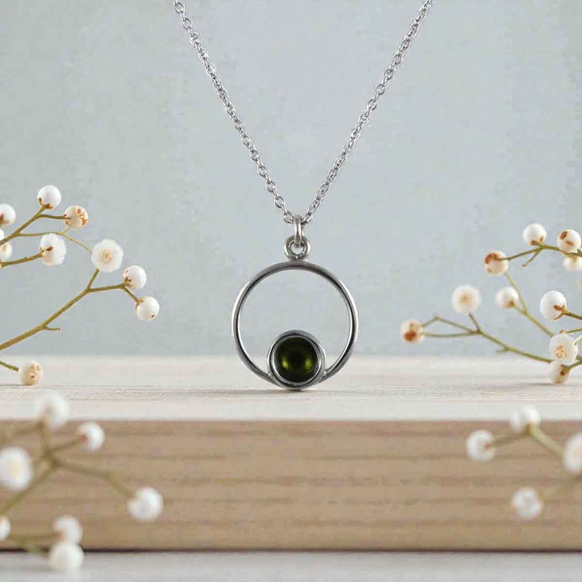 Χειροποίητο μενταγιόν απο ασήμι 925° με πράσινο σμάλτο σε αλυσίδα 925° μήκους 40 εκ. με 5 εκ. προέκταση. Απαλός κύκλος φωτός με μια πινελιά πράσινου
