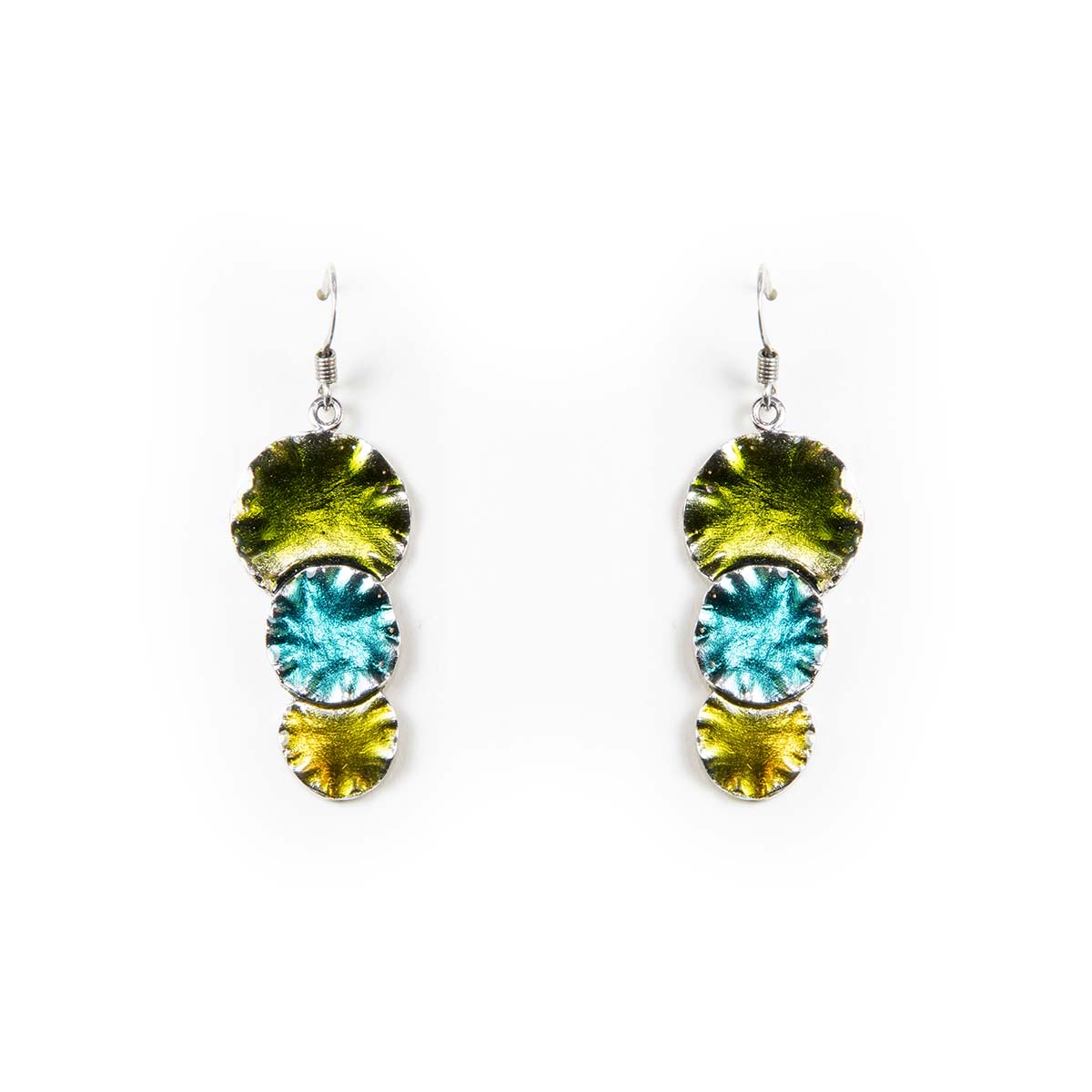 Τρεις κύκλοι που συναντώνται.Η γεωμετρία γίνεται φωτεινή παρουσία.Ενα χειροποίητο κόσμημα απο ασήμι 925°με πράσινες,τυρκουάζ και κίτρινες αποχρώσεις